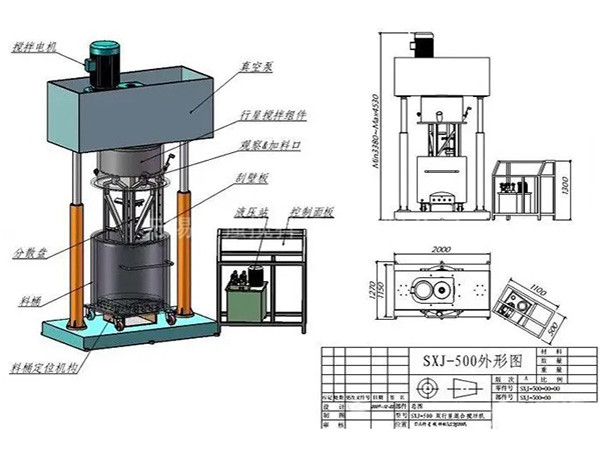 工作原理雙行星分散混合機有高速、低速、活動刮板作攪拌、剪切、刮壁、溶解用。低速運轉的攪拌錨使物料在密閉容器內上下翻動、剪切和混合,高速運轉的齒形分散盤與混合的物料產生強烈的碰擊和剪切,隨著攪拌錨的旋轉,行星架上的活動刮刀隨著旋轉,把釜體上的物料完全刮掉,使聚集物完全、徹底地達到混合、分散、溶解的要求。在其高低速的不同作用下,使物料能夠達到均勻的混合和分散。