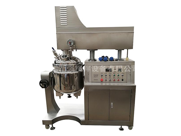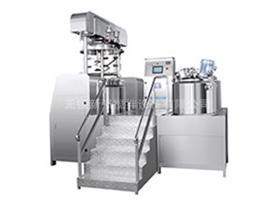 工作原理物料在水鍋、油鍋內通過加熱、攪拌進行混合反應后,由真空泵吸入乳化鍋,通過乳化鍋內上部的中心攪拌、聚四氟乙烯刮板始終迎合攪拌鍋形體,掃凈掛壁粘料,使被刮取的物料不斷產生新界面,再經過葉片的剪斷、壓縮、折疊,使其攪拌、混合而向下流往鍋體下方的均質器處,物料再通過高速旋轉的切割輪與固定的切割套之間所產生的強力的剪斷、沖擊、亂流等過程,物料在剪切縫中被切割,迅速破碎成200um-0.2um的微粒,由于乳化鍋內處于真空狀態,物料在攪拌過程中產生的氣泡被及時抽走。采用抽真空的方式,使所生產的制品在攪拌過程中不再混入氣泡,從而保證可制造出富有光澤、細膩及延展性良好的產品。